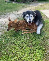 In this cute animal video a small dog cant help but cuddle with this adorable baby.