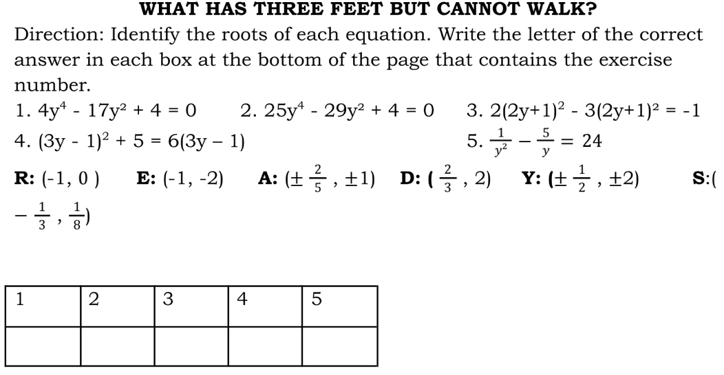 WHAT HAS THREE FEET BUT IT CANNOT WALK. The swifts cant walk. 9 Identify the roots of each equation.